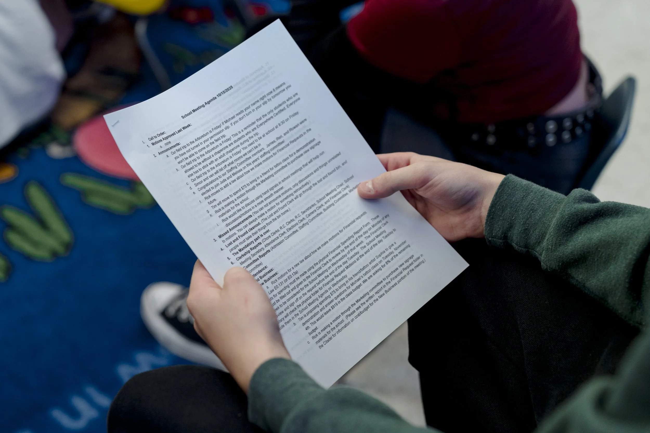 Day-to-day operations at Tallgrass are handled by the School Meeting, which is a weekly non-mandatory meeting where each student and staff member has one vote. Anyone in the school community can make a motion or put a topic on the agenda for discussion. Typical matters handled by School Meeting include changes to school rules, motions to make purchases, and field trips.